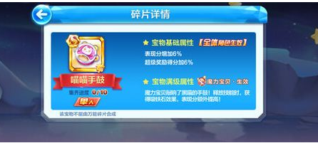 喵喵手鼓是魔力宝贝的单人专属,满级后可使魔力宝贝释放技能时获得吸铁石效果,并提升表现分。