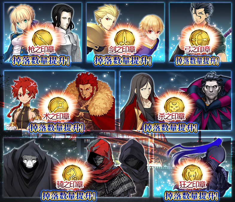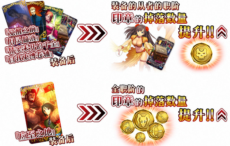通过装备本次活动中全新追加的概念礼装,可以提升装备了这些礼装的从者的职阶所对应的印章的掉落数量。