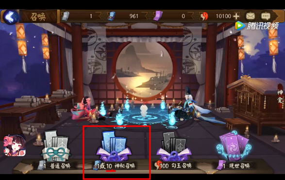 3、即可在召唤界面,看到1或10神秘召唤,点击10神秘召唤,即可进行10连抽抽卡。