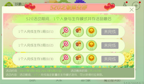 1个人完成生存3局,获得20个棒棒糖,2份神秘美食,100个金蘑菇;