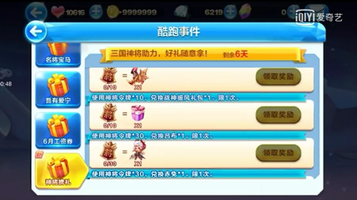 6、神将令牌*1=钻石*20+5级角色升级券*1,限20次。