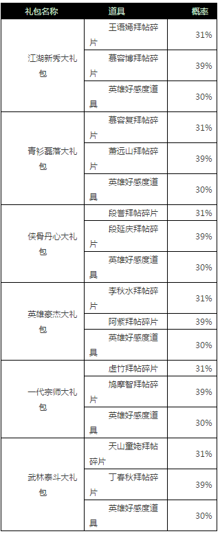 江湖新秀大礼包、青衫磊落大礼包、侠骨丹心大礼包、英雄豪杰大礼包、一代宗师大礼包、武林泰斗大礼包概率如下图,请少侠查看!