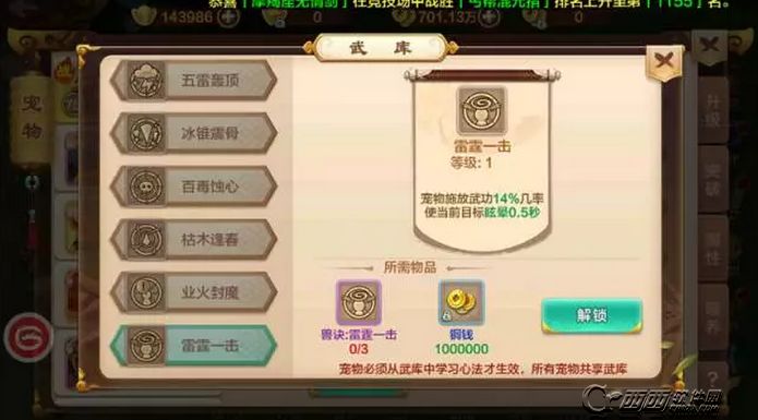 武库则是玩家解锁宠物心法的地方。当玩家获得了足够数量的宠物技能书时,即可花费技能书和一定数量的铜钱来进行解锁。解锁后的心法可以进行升级以加强效果。宠物心法有很多,不过每只宠物最多只能装备5本心法。所有宠物共享武库内的心法。