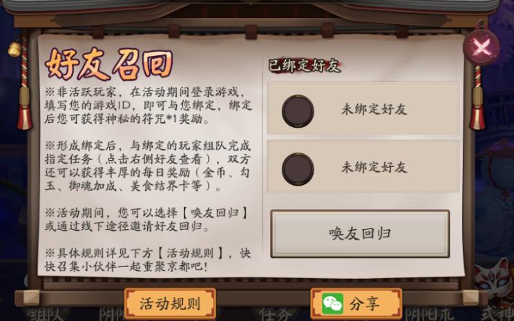 ※形成绑定后,与绑定的玩家组队完成指定任务,不仅可以获得好友组队加成,双方还可以获得丰厚的每日奖励(金币、勾玉、御魂加成、美食结界卡等)。