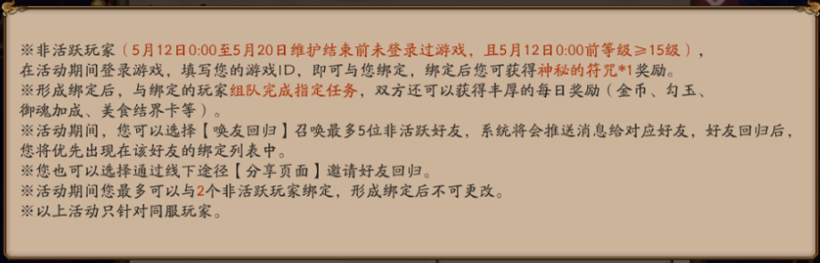 ※非活跃玩家活动期间登录游戏,填写活跃好友(等级≥15级)的游戏ID,即可形成绑定关系。