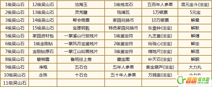 礼包内容包罗万象,小力丸、人参果人人有、好运还能开到宝匣钥匙、更有15级吴山石等你抢!所有可获得道具如下: