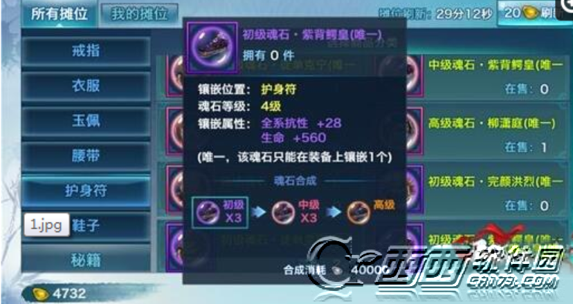 镶嵌在护身符的初级魂石·紫背鳄皇(唯一)紫色品质,全系抗性+28、生命+560。