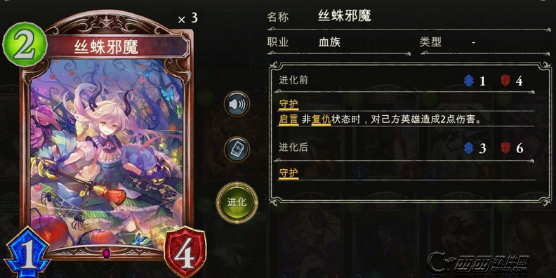 214蛛魔妹子是当前版本血族的神卡之一。3费墙的身材只需要2费。4血意味着,除了法师的虹光以外没有任何2费卡能够解掉她,光头跟龙斗士的进化,老头的红莲也都是解不掉的。不但面对皇家精灵时挡掉各种小怪的攻击有着出色的表现,而且我们自身的高攻卡如444、443也是可以躲在这张卡后面疯狂输出。