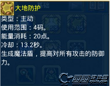 大地加成是一级魔防物防增加百分之二十,持续20秒。每加一级增加百分之十,持续时间增加10秒,也就是加满时候是增加百分之六十魔防物防,持续时间60秒.。