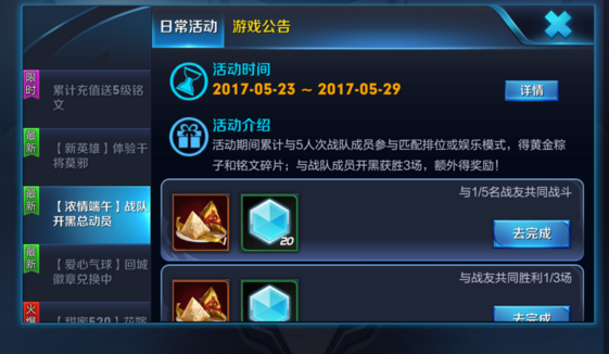 活动介绍:活动期间累计与5人次战队成员参与匹配排位或娱乐模式,得黄金粽子和铭文碎片;与战队成员开黑获胜3场,额外得奖励!
