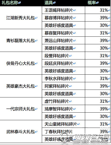 江湖新秀大礼包、青衫磊落大礼包、侠骨丹心大礼包、英雄豪杰大礼包、一代宗师大礼包、武林泰斗大礼包概率如下图,请少侠查看!