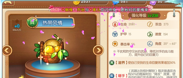 狼牙利器:这款武器的基础生命值虽然略低于热带风情,但是拥有极高的护甲值,同样能起到非常不错的扛伤害效果。其技能【愤怒】可以在被炮弹命中且造成伤害时增加20点体力,作为辅助角色方便打出多样的道具配合。而技能【禁足】在每次普攻都有30%概率触发,若是能命中敌人的主力输出人员,可以使其2回合内无法移动,配合挖坑等战术可以使其陷入被动。