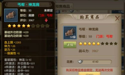 价格也都是非常的便宜。门派套装是游戏前期每天提升战斗力非常好的途径。特别是蓝色5星的门派套装,战斗力更要提升很多。