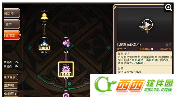 九尾激光EX:中远距离的定点AOE技能,输出量不俗并且有降低致命一击概率这一额外属性,可以减少boss的输出,伤害之余还略带一些辅助效果,十分不错的技能。而且是一个瞬发型技能,技能判定十分优秀,从出现激光到轰击爆炸区域全过程都有伤害判定,可以利用卡身位这类的小技巧,对部分体型巨大的boss打出多段伤害。同时爆炸范围很大,也可以用作清理杂兵,总体而言是一个十分全面的技能,点爆发与AOE兼备,是时空领主在PVE中的神技。