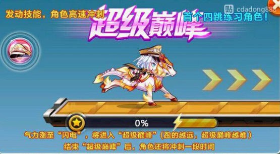 气力涨至闪电,将进入超级巅峰,跑的越远,超级巅峰越难,结束超级巅峰后,角色还将冲刺一段时间。