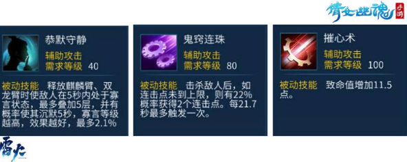 第一类是增强穿云手等技能爆发的天赋,使用恭默守静天赋,可以让敌方陷入沉默,如果击杀敌人还能获得更多的连击点,则会让敌人丧失还手能力。