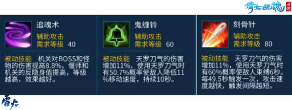 如果想快速刷怪,则可以选择以追魂术为代表的天赋,增加技能对BOSS的伤害。还能够选用刻骨针天赋,配合天罗刀气技能,提高范围攻击能力,在团战中作用巨大!