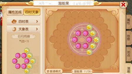但是,潜能果并非只是简单地增加固定数值的人物属性,若是能够组成符合要求的图案,还可以获得额外的属性加成。目前,潜能果的组合分为四时和天象两种。其中,四时有四个图案,分别为春雷、夏雨、秋风和冬雪,使用同种颜色的潜能果即可组合而成;而天象则包括10个图案,分别为白虹贯日、彗星袭月、荧惑守心、太白经天、命宫摩羯、九星连珠、众星拱月、日月同辉、星河灿烂和天关星客,想要组合成天象中的图案,需要玩家使用与图案里相对应的潜能果才行。根据所组合的图案,玩家能够获得的额外属性也有所不同,如“春雷”增加法术防御,而“白虹贯日”则增加物理伤害。全新潜能果玩法,多种图案任组合,建议玩家根据自身门派及所需进行潜能果组合,从而获取最大效益!