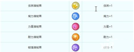 与人物属性相对应,潜能果共包括5种属性,分别为体质、魔力、力量、耐力、敏捷,使用潜能果可以相应增加人物1点属性,玩家也可以通过使用对应种类的人参果来调整每个潜能果所增加的属性点类型。需要注意的是,兑换第一个潜能果所需要的经验为3000万,此后每兑换一个潜能果所需的经验都会逐次增加,且处于不同级别阶段的玩家所能兑换的数量亦有所不同,69级玩家最多可兑换12个,70-89级玩家兑换数量为24个,90-109级玩家则为36个。