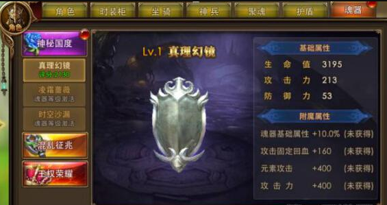 魂器总共分为三个阶段:神秘国度、混乱征兆、王权荣耀。当等级达到460级时,魂器将自动开启并解锁神秘国度的第一阶段:真理幻境。开启魂器将增加基础属性和附魔属性,包括攻击固定回血、增加元素攻击力、眩晕抗性等加成,可以大大提高人物战斗力。