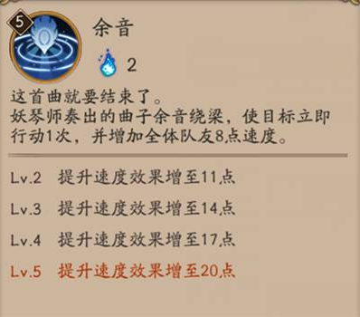 妖琴师的核心技能是余音,让目标立即行动一回合,同时给全队增加最高20点速度持续一回合。
