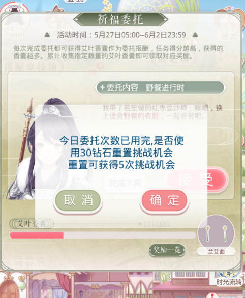 每天一个心愿委托,每个委托免费5次,可重置,每30钻重置5次