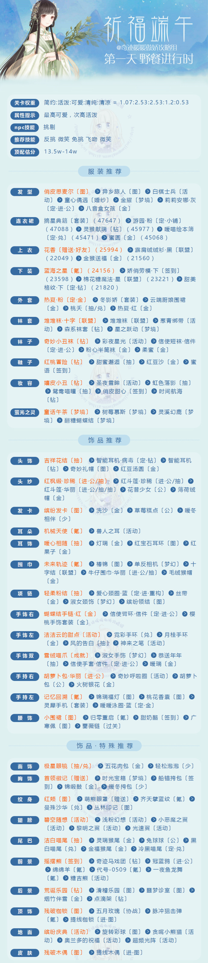 奇迹暖暖野餐进行时怎么搭配,奇迹暖暖野餐进行时高分搭配推荐。奇迹暖暖今天开启了端午节的活动-祈福端午,每天的主题关卡都是不同的,今天的主题是野餐进行时,奇迹暖暖野餐进行时怎么搭配,西西小编为大家带来奇迹暖暖野餐进行时高分搭配推荐。
