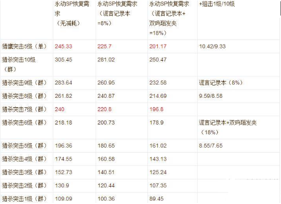 拿猎杀5级(双永恒谎言)和6级(双玛瑙谎言)比较的话,两者sp消耗相近,差不多都是179。