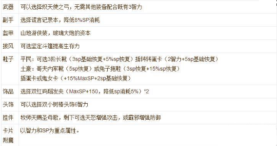 SP%恢复主要来自于牧师的圣母颂歌200%,兔子拖鞋15%,其余不考虑。MaxSP可选小恶魔气球10%,鬼女卡15%,以及双玛瑙发夹都有提供300SP。