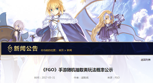 冠位指定FGO手游这款游戏中有很多随机的奖励和玩法,文化部的一纸通知之后,国内众多游戏厂商纷纷开始公布自家游戏中随机抽取类玩法的概率。冠位指定FGO手游在昨日已经正式推出自己的抽取概率,下面就为大家带来详情内容介绍。