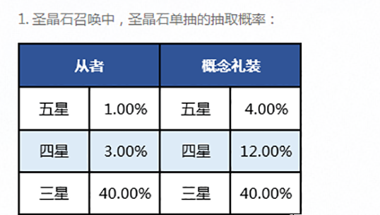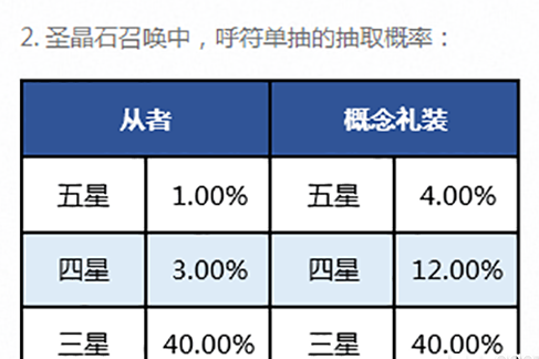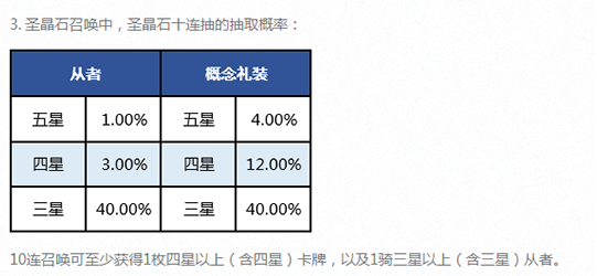 根据官方消息显示,在圣晶石召唤中,无论是单抽的抽概率还是十连抽的抽取概率,获得五星、四星及三星从者/礼装的概率都是相同的。另外,不管是使用呼符抽卡还是圣晶石,其最终的抽取概率也都是一样的。