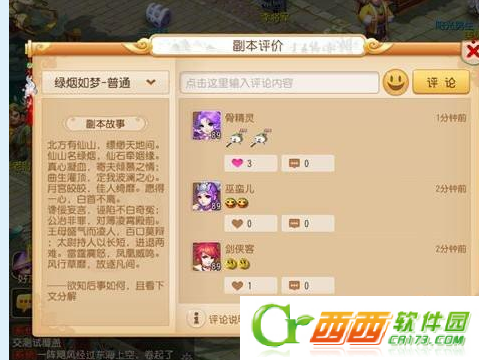 展示全服玩家对副本的评论。玩家在新副本通关后有概率获得道具“紫毫笔”,使用该道具可对副本进行评论(每次消耗1个)。