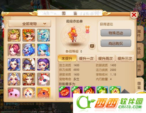 神兽的初始资质成长固定,没有办法通过炼兽真经和资质培养丹等途径来提升其资质,只能在到达相应的等级之后到超级赤焰兽NPC处进行资质和成长属性的提升,每次提升需要花费20个神兜兜。