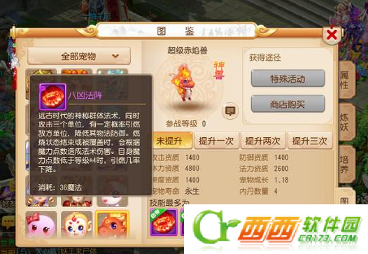 技能分析:有自己独特的技能八凶法阵,这个技能是一个群体法术技能,可以攻击三个目标,效果还是非常不错的,其余的四个技能有两个是高级技能,两个是普通技能,从整体技能来看超级赤焰兽还是非常不错的。