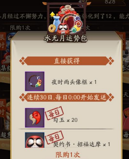 阴阳师水无月运势包性价比:作为俗称的月卡,在2017年增加了新的头像框的奖励,基本都是限量版,勾玉除外,其他两个加成是非常可观的,如果想要长期玩的话,建议入手。