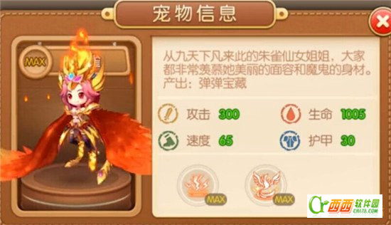 在宠物的搭配上。西西小编选择了六十级宠物朱雀,它的主动技能一击必杀,和被动技能浴火重生,能够提高武器在本回合内提高32%攻击和20%暴击率,并且在受到伤害时有18%几率受到庇佑不会死亡,清除减益状态并获得满体力和蛮怒气,立即获得行动回合,该效果有六回合CD。