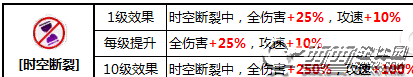 一个有趣的buff,效果触发只能在时空断裂中,相当于一种瞬间爆发的buff,加的是全伤害还有攻速(次元qte终于可以加成了!泪奔!)当然了如果阵容无法打出长时间的或者触发频繁时断的角色,还是不推荐带的。