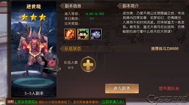 轩辕传奇手游逆世境副本是不周山北侧幽隐之地,逆世境中现在又有阴谋,逆世境副本怎么打,下面就和西西来看看轩辕传奇手游逆世境三星通关攻略,希望对大家有帮助。