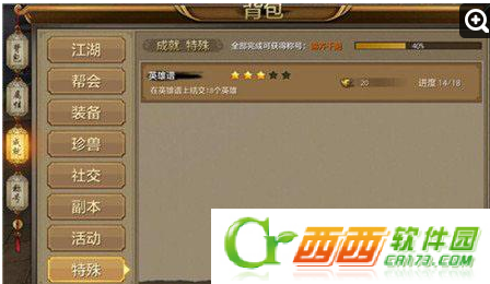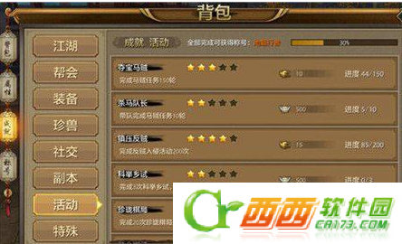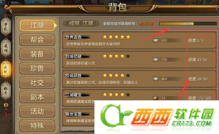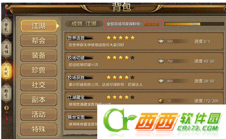 世界语音,校场切磋,校场获胜,江湖仓图,稀世宝图,五个系列。全部完成可以获得称号,誉满江湖。