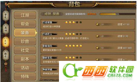 神器铸造,神器突破,暗器修炼,暗器品质,镶嵌宝石,打造装备,打造匠人,装备强化,八个系列。全部完成可以获得称号,铁甲神兵。