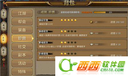 捕捉珍兽,捕兽能手,繁殖能手,珍兽提悟,四个系列。全部完成可以获得称号,四海通灵师。