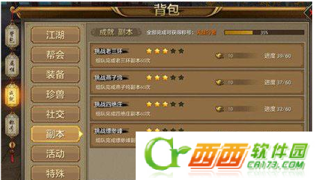 挑战老三环,挑战燕子坞,挑战四绝庄,挑战缥缈峰,四个系列。全部完成可以获得称号,天战行者。