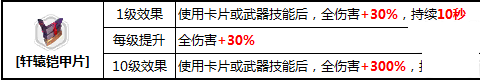有趣的触发条件,而且,这个buff令人瞩目的是主动技能使用后的全伤害增幅,目前版本依靠武器成名的角色可有不少(电磁月光,磁暴鬼铠,索尔游侠,雷切影舞,3rd因为没有主动技则不在此列),所以,如果能保持当前角色的sp充足,主动技能不停释放的话,增幅效果还是相当可观的,起码不比复仇buff的增幅差。