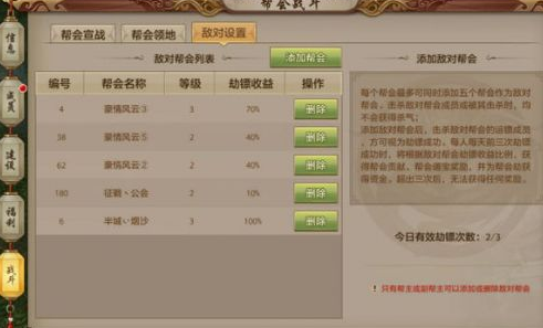 每天中午12:30-13:30,晚上20:30-21:30,可以进行帮会运镖和帮会劫镖活动,每个玩家每天可以分别运镖三次和劫镖三次。运镖成功获得帮贡,帮会通宝,帮会资金的奖励。劫镖成功可以获得对方镖车百分比的奖励,具体奖励数值,
