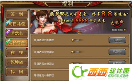 说到绑定元宝,第一个要介绍的就是成长基金了。购买成长基金需要88元,购买后立即获得880元宝,之后玩家在等级达到30-70级时,根据等级达标,可以领取9次,共计6888绑定元宝。这是游戏中可以获得绑定元宝,最多,也是最方便的途径。