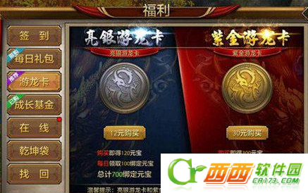 游龙卡通俗点来说就是周卡和月卡。亮银游龙卡,周卡购买需要12元,购买后立即获得120元宝,之后7天,每天可以领取100绑定元宝,共计700绑定元宝。紫金游龙卡,月卡,需要30元购买,购买后立即获得300元宝,之后30天每天可以领取120绑定元宝,共计3600绑定元宝。长期玩游戏的小伙伴们必备哦。