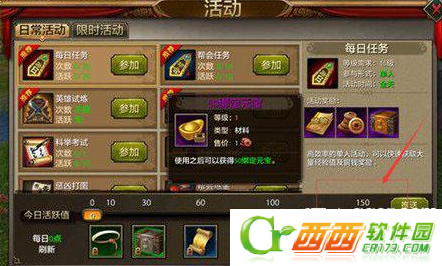 天龙八部手游中,每日都有活跃值玩法,根据玩家当日参加各种活动获得的活跃值,给予奖励,每日活跃值150点的奖励是50绑定元宝,每日0点刷新奖励。