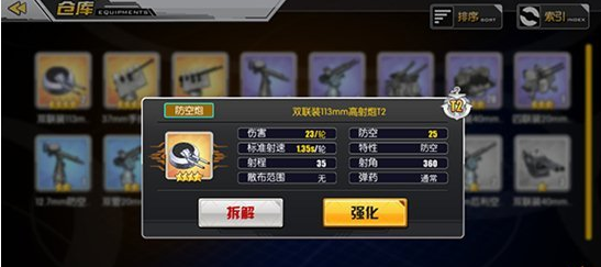 首先是驱逐舰上使用的主要装备—鱼雷和防空炮。防空炮的防空数值加成相同,不同的主要是伤害、射速和射程,考虑到防空的效果,小编认为有限射程,这样在敌方舰载机接近的时候,就可以提前发现并进行攻击。而伤害与射速遵从了速度越快伤害越低,速度慢伤害高的原则,所以在真正选择的时候可以慢慢斟酌。
