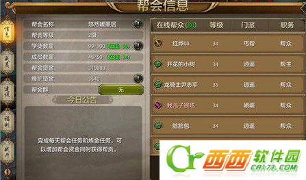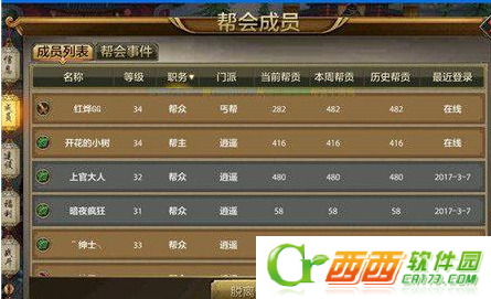 帮会成员界面,可以查看到所有的帮会成员的信息。包括成员的等级,帮会中的职位,门派,当前帮贡,本周帮贡,历史帮贡,以及最近登录的时间。在这里还可以点击每位成员进行聊天,交友和邀请组队。然后还可以看见种种的帮会事件,例如加入帮会的新成员,以及退出帮会的成员等等。