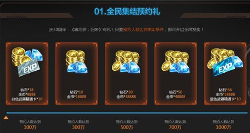 1000万预约人数:钻石*66、金币*58888、蓝色武器精通卡*10